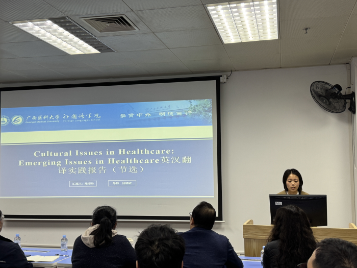 23级翻译专业的两名硕士研究生李可和陈巧玲进行了汇报。李可以“纽马克翻译理论指导下的医学文献英汉翻译实践报告——以《Rosacea, microbiome and probiotics the gut-skin axis》为例”为主题,从纽马克的语义翻译和交际翻译理论出发,系统阐述了在医学文献翻译中所面临的难点与应对策略。陈巧玲以“Cultural Issues in Healthcare: Emerging Issues in Healthcare 英汉翻译实践报告(节选)”为题,结合翻译案例从词汇和句法层面展开分析,探讨了纽马克交际翻译理论对翻译实践的指导作用。副院长吕晓敏作为本期主要点评硕导,在点评时肯定了案例分析的系统性和多样性,提出了增加典型案例数量、补充数据支撑、完善目标读者评估等建议,以增强论文的严谨性和创新性。其他硕导对两位汇报同学进行了指导并给出的修改建议。